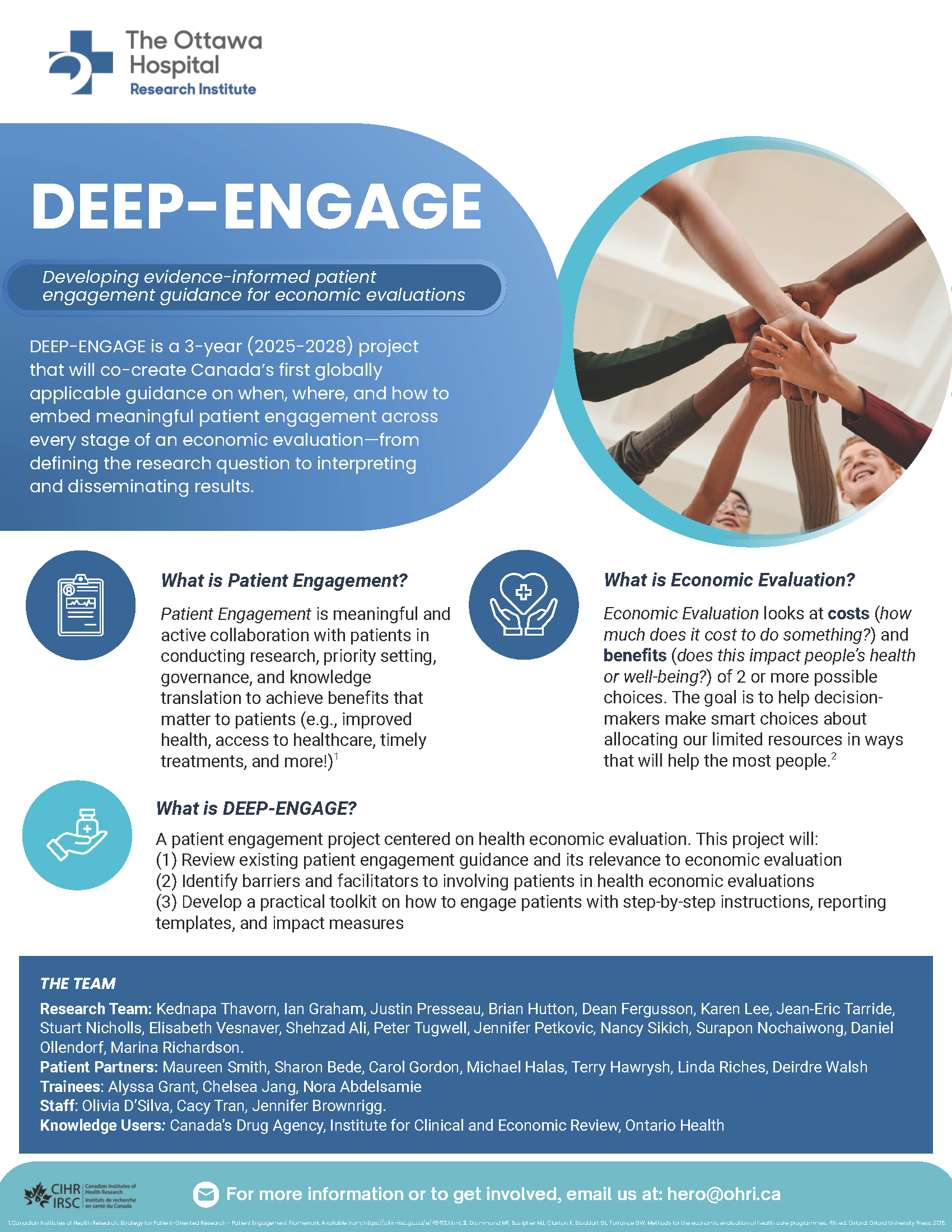 DEEP-ENGAGE will deliver a toolkit that makes it transparent how patient input influences each value-for-money study, thereby strengthening the legitimacy of funding decisions. Health economists and health technology assessment agencies—including Ontario Health, Canada’s Drug Agency (CDA), and Institute for Clinical and Economic Review (ICER)—will refine and disseminate the guidance using established knowledge-mobilization platforms: CDA’s Learning Hub and symposium, Ontario Health’s HTA network, ICER’s webinar series, and the Ottawa Hospital Research Institute’s seminar series. By embedding lived experience in economic evaluations, the project will enable Canadian and international decision-makers to reach funding choices that are fairer, more transparent, and clearly aligned with what matters most to patients and caregivers.