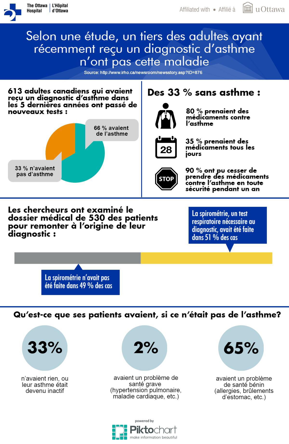 « Il est impossible de savoir combien de ces patients avaient reçu à l'origine un diagnostic erroné et chez combien d'entre eux l'asthme n'est plus actif », affirme l'auteur principal de l'étude, le Dr Shawn Aaron, scientifique principal et pneumologue à L'Hôpital d'Ottawa et professeur à l'Université d'Ottawa. « Nous savons toutefois que tous ces patients ont pu cesser de prendre des médicaments dont ils n'avaient pas besoin, des médicaments chers et qui peuvent entraîner des effets secondaires ». Parmi les participants qui n'avaient pas d'asthme, 80 % d'entre eux prenaient des médicaments, et 35 % en prenaient tous les jours.